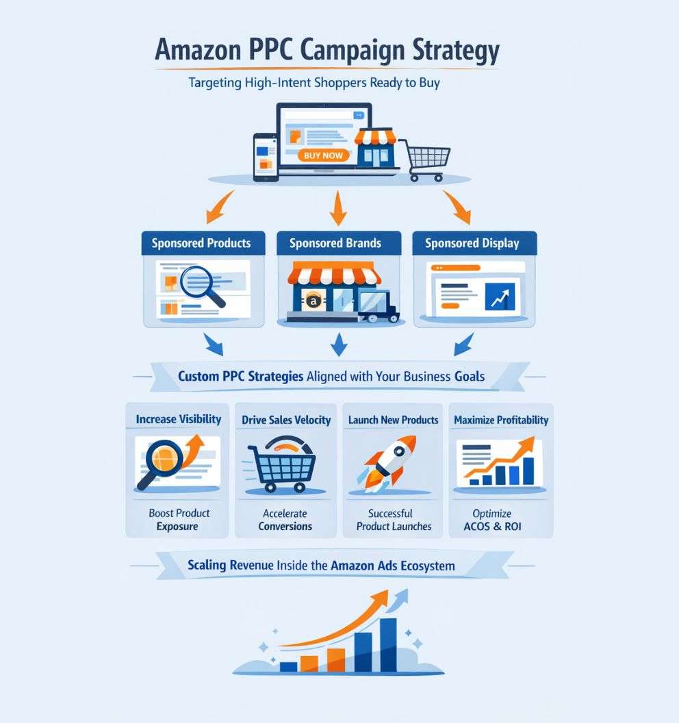 We design high-performance Amazon PPC campaign strategies that place your products directly in front of high-intent shoppers, right at the moment they’re ready to buy. From Sponsored Products to Sponsored Brands and Display Ads, we build your Amazon paid strategy from the ground up, aligned with your business objectives. Whether your goal is increasing product visibility, driving consistent sales velocity, launching new products, or maximizing profitability and ACOS, we optimize every touchpoint to scale your revenue inside the Amazon Ads ecosystem.