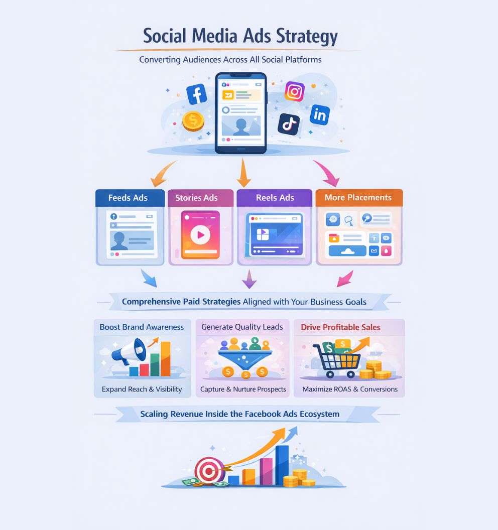 We specialize in developing data-driven Facebook ads strategies that precisely target your ideal audience across all placements; feeds, stories, reels, and more, at the optimal time. Our comprehensive paid strategy covers everything from initial audience research and creative testing to funnel optimization, meticulously built to align with your specific business objectives. Regardless of whether your goal is massive Brand Awareness, generating quality Leads, or achieving profitable Sales with a strong ROAS, we fine-tune every campaign within the Facebook Ads ecosystem to effectively convert audience attention into valuable business action.