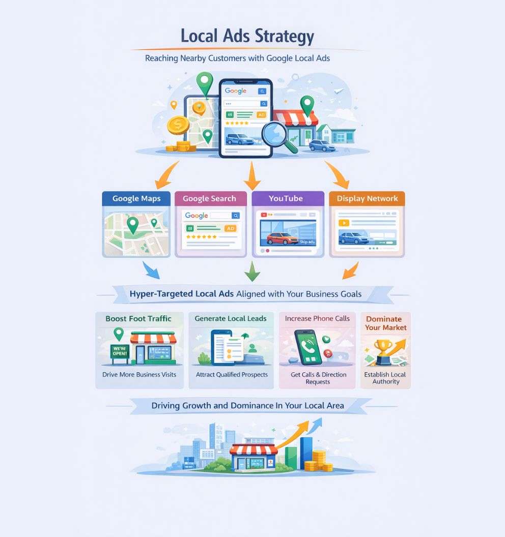 We specialize in creating highly effective local advertising strategies, leveraging the Google Local Ads ecosystem to achieve your growth targets. Our approach involves designing campaigns with hyper-targeted, location-based and intent-driven creatives that place your business directly in front of nearby customers at the moment they are searching, browsing, or ready to engage. Whether your primary goal is to boost foot traffic, generate qualified local leads, increase phone calls and direction requests, or establish dominance in your local market, we build your paid strategy from the ground up. We meticulously optimize every campaign to ensure measurable results that align with your specific objectives.